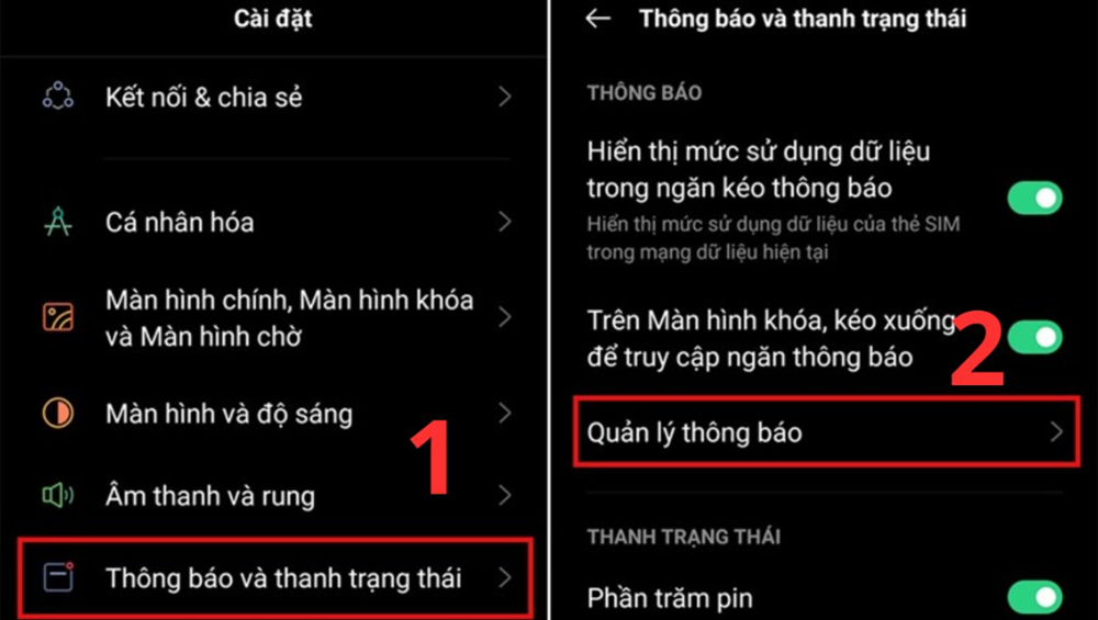 Bước 1: Mở điện thoại, đi đến “Cài đặt” nhấp vào mục “Thông báo và thanh trạng thái” đi đến mục “Quản lý thông báo”.