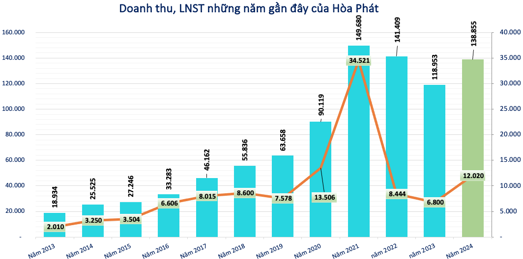 Thực tế, dù chưa thể đạt đến giai đoạn hoàng kim như năm 2021, kết quả kinh doanh năm 2024 của “gã khổng lồ” ngành thép vẫn rất ấn tượng trong năm vừa qua. Hòa Phát ghi nhận doanh thu 138.855 tỷ đồng, tăng 17% YoY, hoàn thành kế hoạch. Lợi nhuận sau thuế đạt 12.020 tỷ đồng, tăng mạnh 77% qua đó vượt 20% chỉ tiêu cả năm.