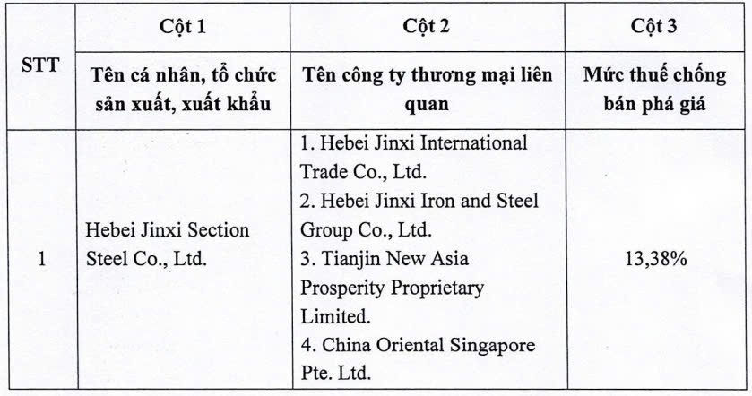 Trước đó, Bộ Công Thương liệt kê danh sách 14 nhà sản xuất và đơn vị kinh doanh xuất nhập khẩu của Trung Quốc bị áp thuế chống bán phá giá chính thức, trong đó Công ty Jinxi chịu mức thuế 29,4%. Như vậy, mức thuế mới đã giảm hơn một nửa.