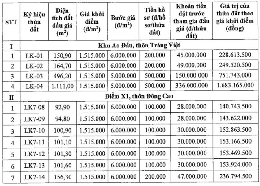 Theo đó vào ngày 13/12, huyện đấu giá quyền sử dụng đất đối với 4 thửa đất tại khu Ao Đấu, thôn Tráng Việt, và 7 thửa đất tại điểm X1, thôn Đông Cao, xã Tráng Việt. Diện tích các thửa đất từ 92m2 đến 1.111m2, giá khởi điểm từ 1,5 triệu đồng/m2.