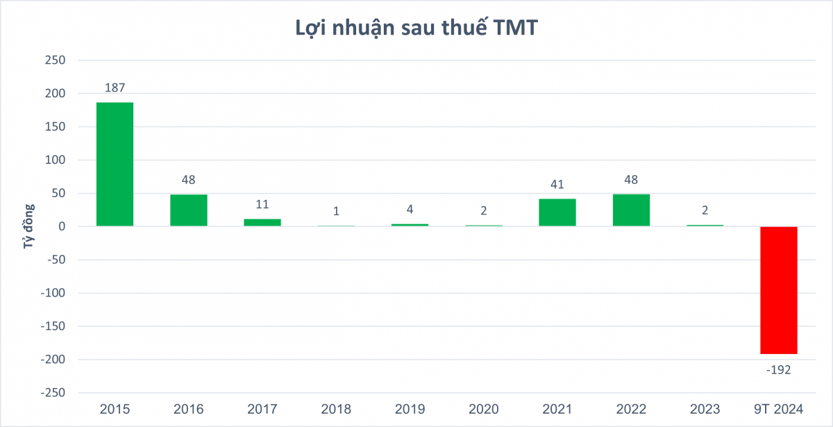Trước đó, TMT đã trải qua quý II/2024 với mức lỗ ròng cao nhất trong lịch sử hoạt động, lên tới 99 tỷ đồng. Sau 9 tháng đầu năm, doanh nghiệp ghi nhận doanh thu 1.675 tỷ đồng và lỗ sau thuế 192 tỷ đồng. Điều này khiến vốn chủ sở hữu tại ngày 30/9 còn 246 tỷ đồng, giảm 44% so với đầu năm.