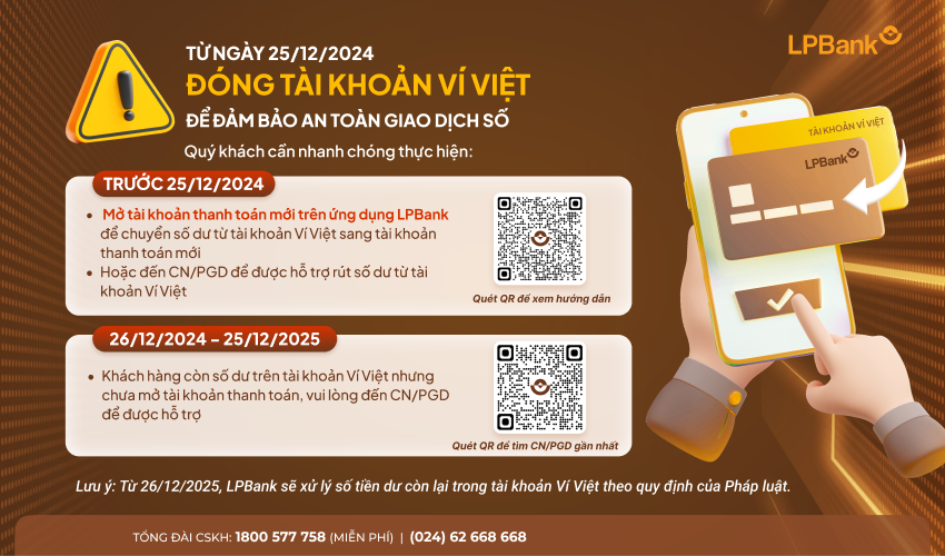 Để không bị gián đoạn các giao dịch, LPBank khuyến nghị khách hàng chủ động thực hiện sớm các giao dịch cần thiết, ưu tiên mở tài khoản thanh toán mới để chuyển số dư từ tài khoản Ví Việt sang tài khoản thanh toán hoặc tới các Chi nhánh, Phòng Giao dịch gần nhất để được hỗ trợ.