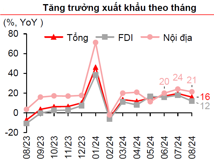 Hơn nữa, sự phục hồi của nhu cầu tiêu dùng toàn cầu, đặc biệt là tại các thị trường lớn như Mỹ và EU, đang hỗ trợ tích cực cho ngành xuất khẩu của Việt Nam. Số liệu từ Tổng cục Thống kê cho thấy cán cân thương mại trong tháng 8/2024 thặng dư đạt 4,5 tỷ USD, mức cao nhất kể từ tháng 8/2020. Các đơn hàng xuất khẩu mới, đặc biệt là trong ngành điện tử, tiếp tục tăng mạnh, cho thấy dấu hiệu phục hồi của ngành sản xuất.