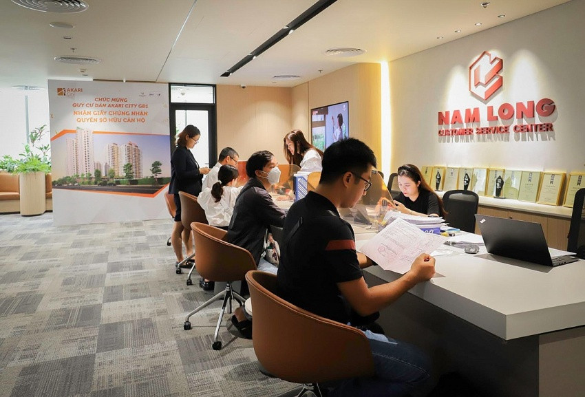 | Ảnh minh hoạ: Khách hàng làm thủ tục nhận bàn giao sổ hồng dự án Akari City giai đoạn 1. Nguồn: Nam Long |