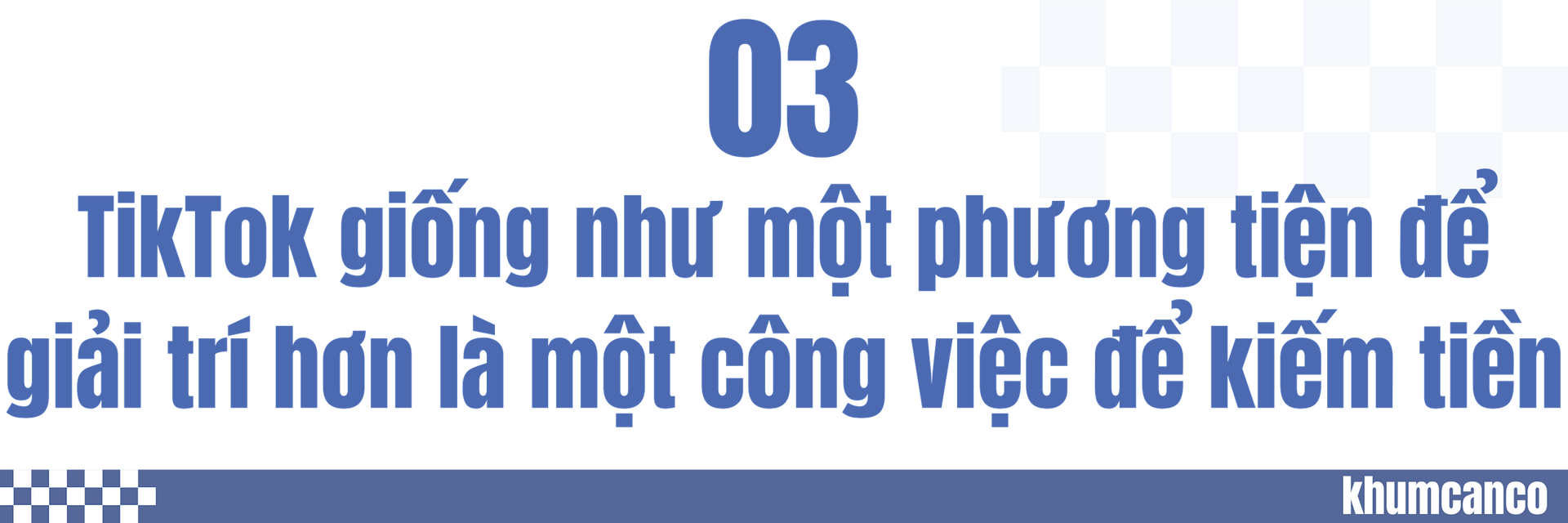 Vì thế nên khi bắt đầu chơi TikTok, mình mong muốn được bày tỏ những gì thật nhất về bản thân mà không phải cố gắng trở thành một ai khác. Cũng hơi trẻ con nhưng đó chính là lý do cái tên “khum cần cố” ra đời đấy (cười).