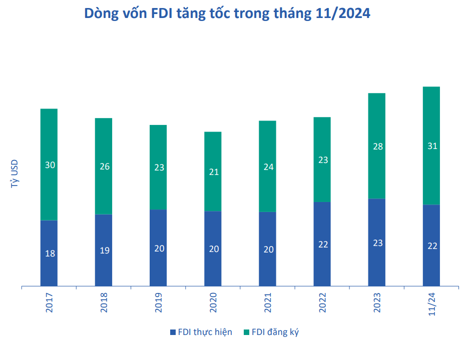 | Dòng vốn FDI tăng trưởng qua các năm, tăng tốc trong tháng 11/2024. Nguồn: Công ty Cổ phần Chứng khoán BIDV (BSC). |