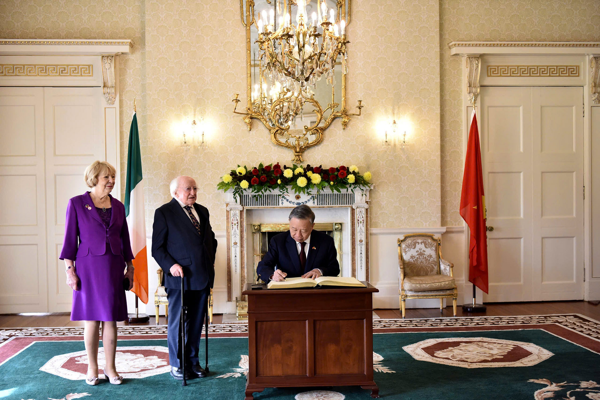 Trước đó, tại Phủ Tổng thống, Tổng Bí thư, Chủ tịch nước Tô Lâm đã ký và ghi sổ lưu niệm với nội dung: “Tôi vui mừng đến thăm đất nước Ireland - "hòn đảo ngọc" tươi đẹp, giàu truyền thống văn hóa và rất cảm kích về sự đón tiếp trọng thị, nồng hậu mà ngài Tổng thống và nhân dân Ireland đã dành cho tôi và Đoàn đại biểu cấp cao Việt Nam. Dù xa cách về địa lý nhưng với sự chia sẻ chung về lịch sử đấu tranh lâu dài để giành độc lập và kiên cường vươn lên, Việt Nam và Ireland đã xây dựng được mối quan hệ bền chặt trong gần ba thập kỷ qua kể từ ngày thiết lập quan hệ ngoại giao.