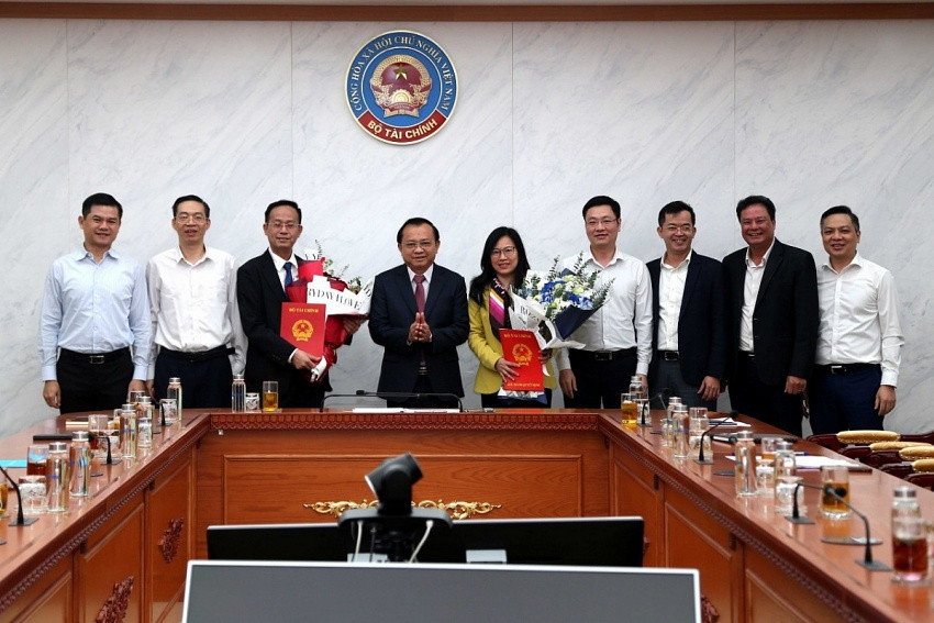 Thứ trưởng Bộ Tài chính Lê Tấn Cận thay mặt Ban Cán sự Đảng Bộ Tài chính trao các quyết định bổ nhiệm và điều động, đồng thời gửi lời chúc mừng tới ông Lưu Đức Huy và bà Nguyễn Thị Thanh Hằng.